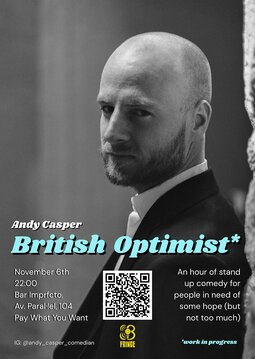 Is it possible to be British AND an optimist? Award winning comedian Andy Casper seeks to find this out in his new show: British Optimist. With his trademark absurdist approach to stand up comedy, Andy will be making fun of his experience of living in Spain, being in charge of the longest running English comedy show in Barcelona, and old people in museums.*